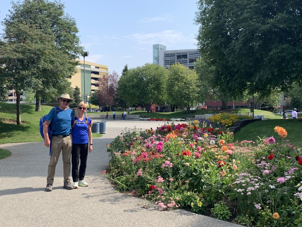 Nous avons donc profité de la journée du lendemain pour marcher jusqu’au Centre-ville en passant au travers du bois et en longeant la baie. Une peu de magasinage et visite de la ville. Plus de 13 kilomètres de marche au retour à notre camping. Ce soir, souper dans une pizzeria très recommandée avec un menu sans gluten. Merveilleux! Je vous laisse découvrir dans le vidéo ci-joint qui nous avons rencontré … Au final, ce fut un beau séjour à Anchorage. Et nous y reviendrons … À suivre!
