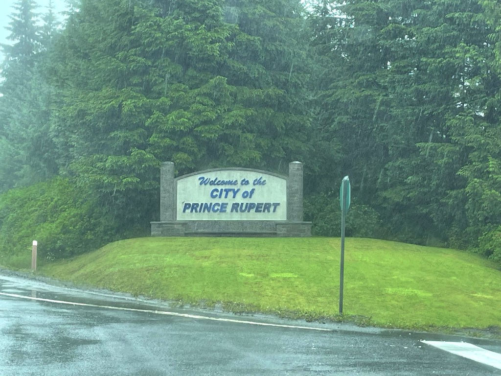 Dimanche 24 juillet. Jean-Claude veut aller voir Prince Rupert, ville côtière d’environ 13 000 habitants la plus à l’ouest de notre périple. Micheline et Michel décident de ne pas venir avec nous pour profiter d’un dimanche tranquille. Nous partons vers 9h00. La météo ne sera pas de notre côté… pluie à 100% de probabilité de précipitations…
