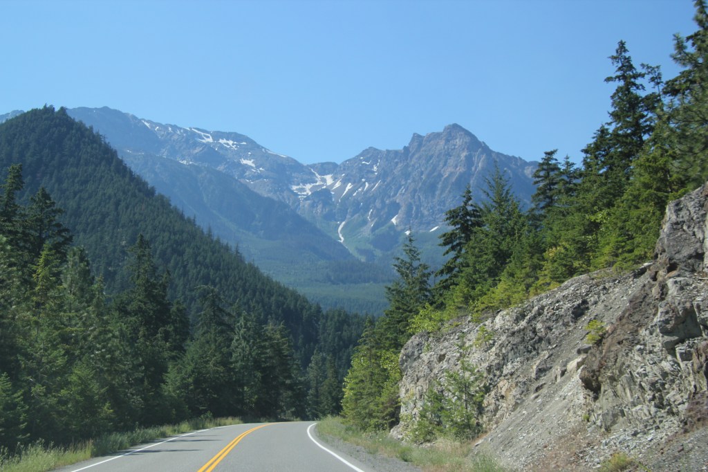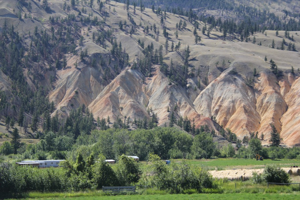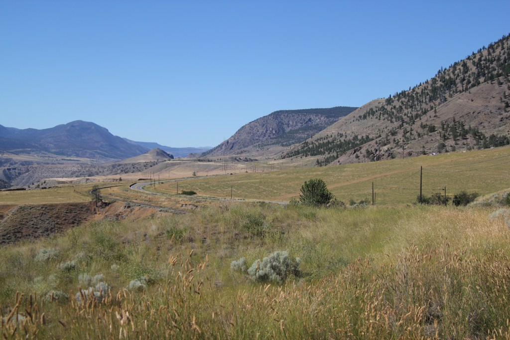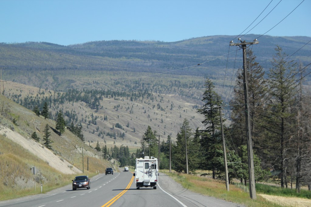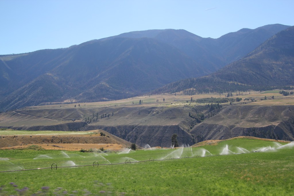 26 et 27 juillet. Beau soleil. Aucun nuage. Très chaud: 32C et 38C. Imaginez sans air climatisé dans le camion. On sue, mais on s’hydrate et on se dit que ça fait longtemps que l’on demande de la chaleur. Nous avons été exaucé au-delà de nos espérances!!! Si c’est comme la lampe d’Aladin, il faudrait être un peu plus stratégique dans ce que l’on demande … Donc, on ne se plaint pas: crème solaire, eau et musique forte. On apprécie chacun des kilomètres parce que la vallée du Fraser est vraiment belle avec ses montagnes, ses ranchs, ses fermes et exploitations agricoles. C’est le temps des foins et ça sent vraiment bon, les fenêtres ouvertes. Plus on avance et plus les champs et les collines avoisinantes sont secs, sans arrosage. Il y a a aussi beaucoup de circulation et surtout des camions de transport. On approche du Sud et des grandes villes.