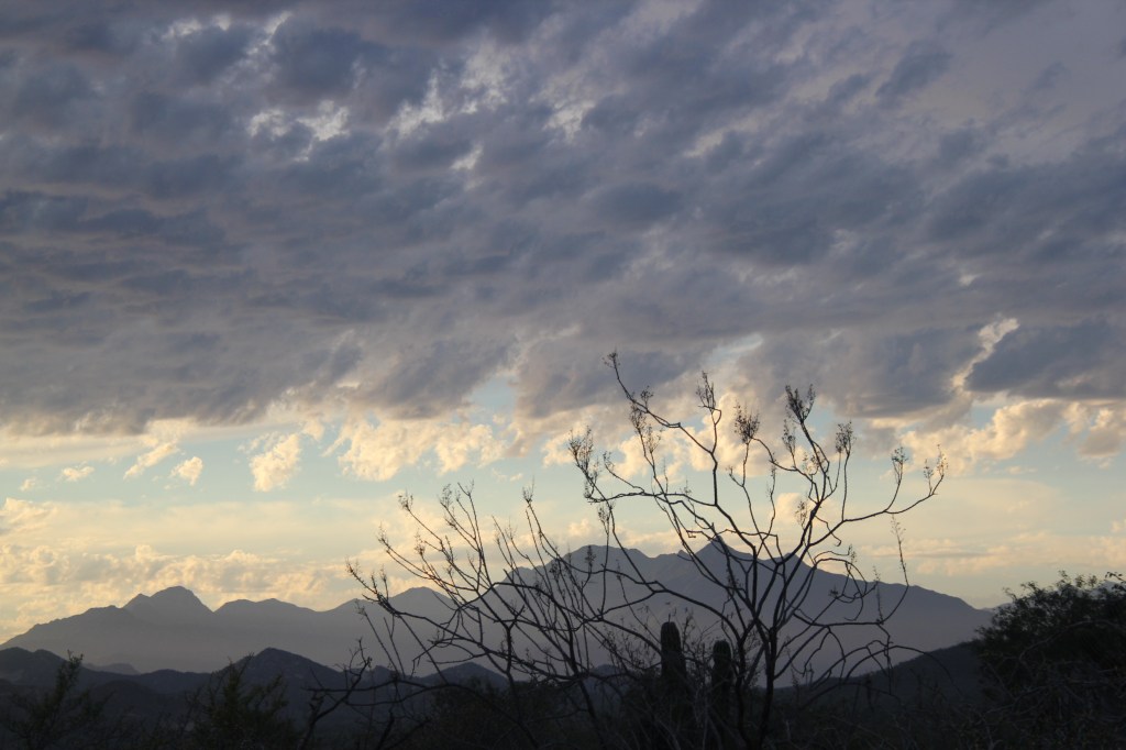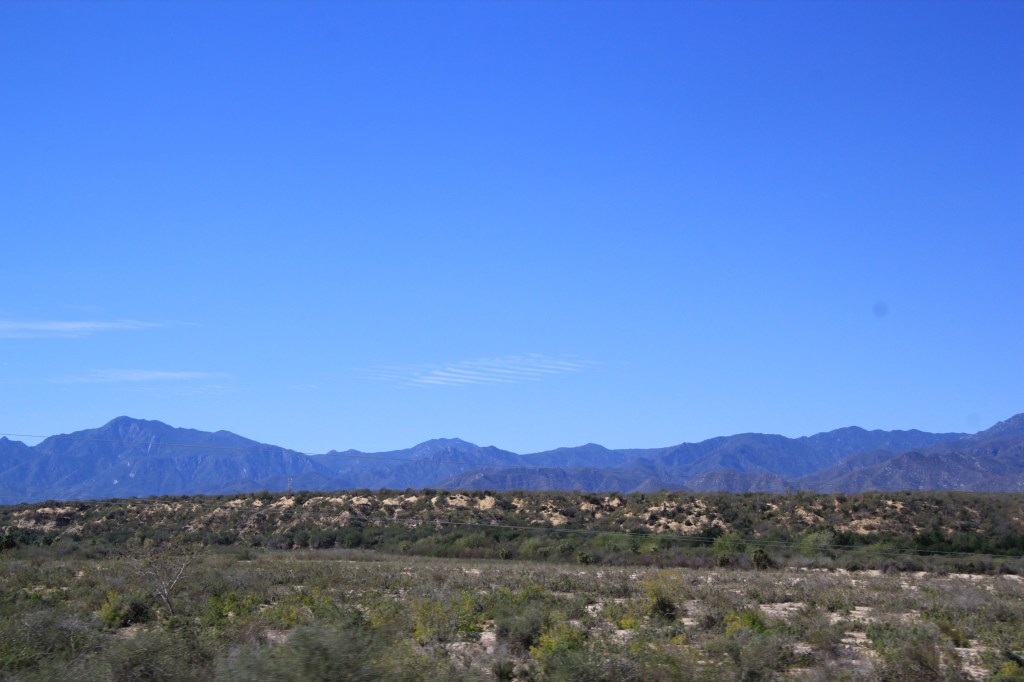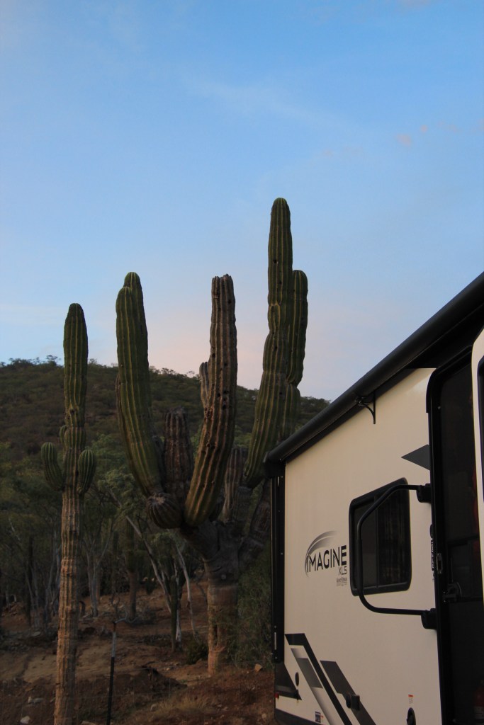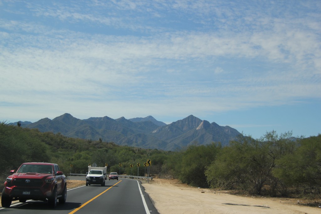 Nous sommes partis de Los Barriles sous un soleil de plomb. La température a monté jusqu’à 34 C. On ne se plaint pas, au contraire! La route est belle et nous avons suivi les montagnes jusqu’à Los Cabos. La végétation continue à changer, les cactus partagent maintenant le terrain avec des feuillus et quelques arbres fruitiers. Les palmiers sont aussi présents dès qu’il y a un peu d’eau.