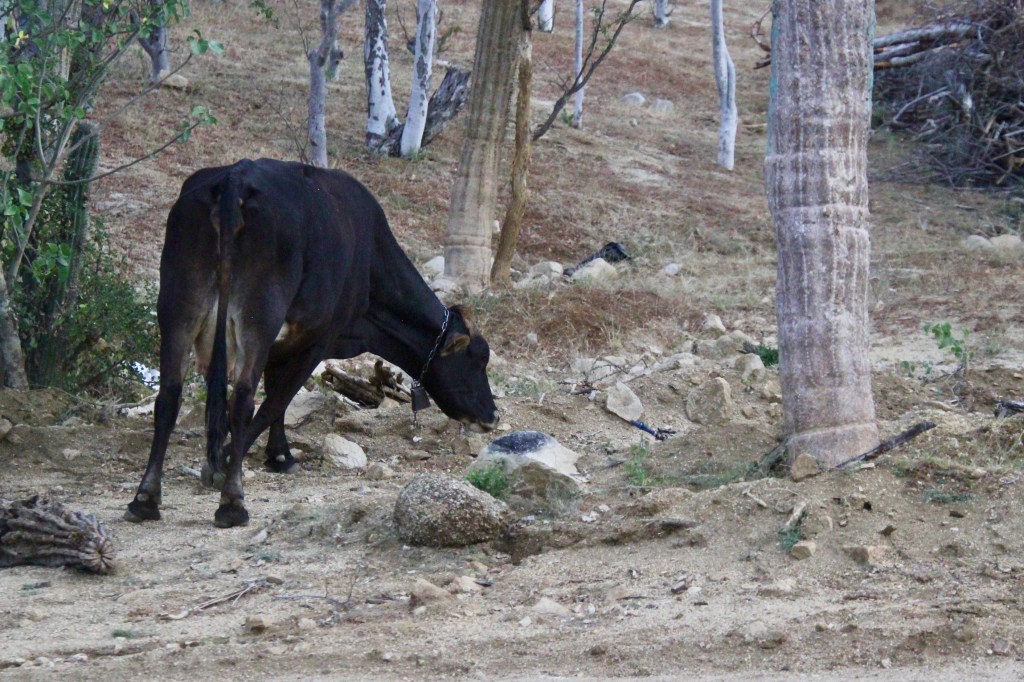 Le camping, nouvellement ouvert, est situé en périphérie tout près d’une autre belle plage. Périphérie … nature … cactus … et vache à cloche qui nous réveille ce matin …