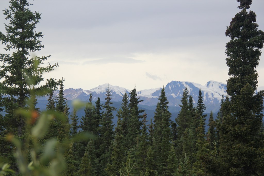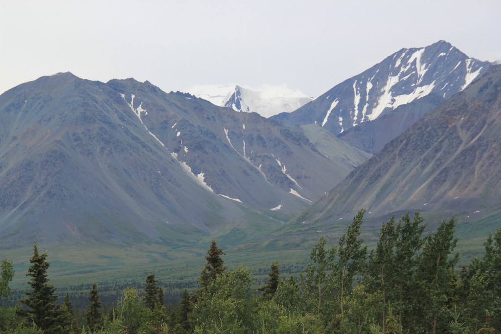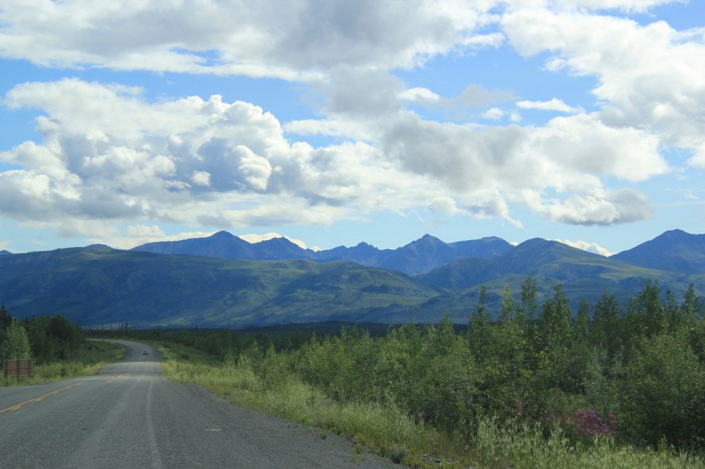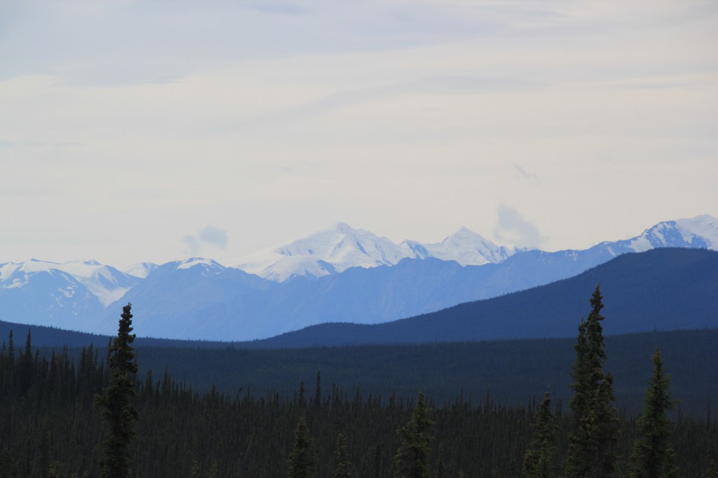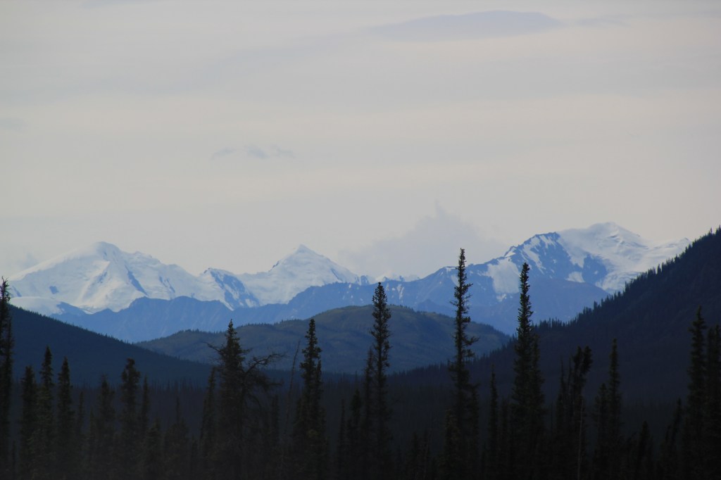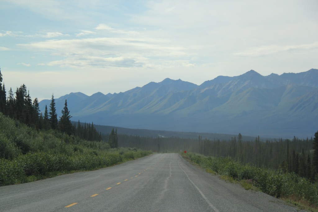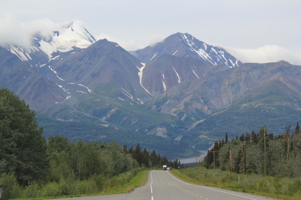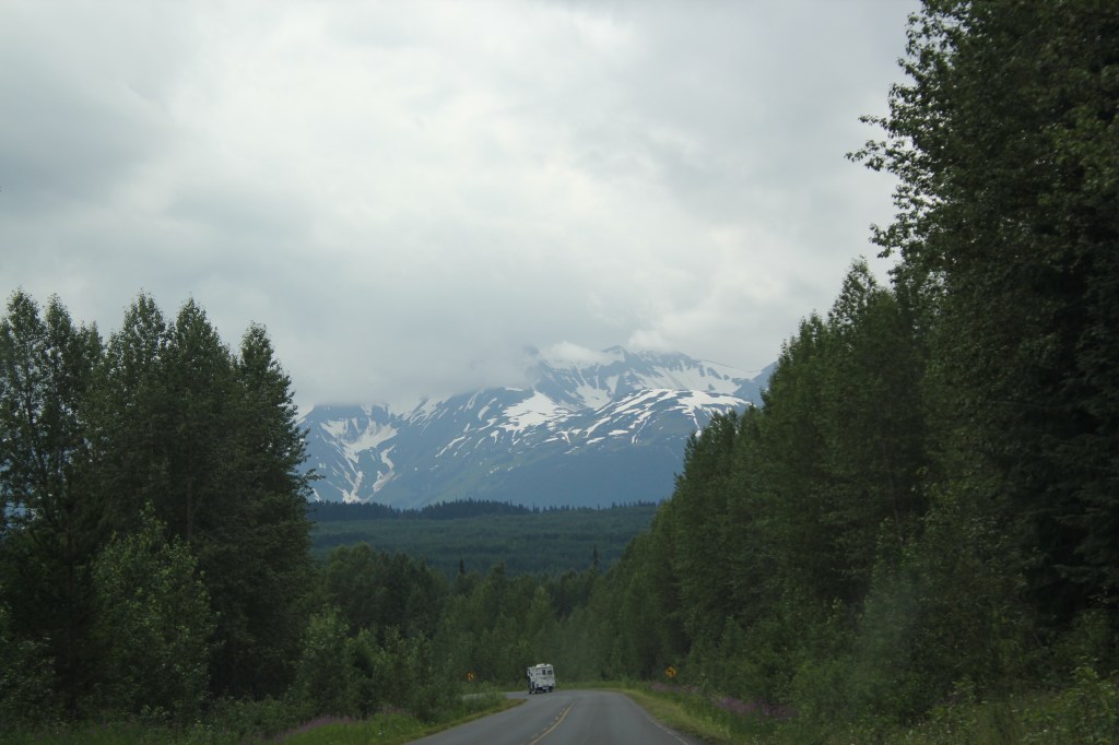 La route était par contre très belle. Sans être parfaite, la visibilité était tout de même bonne et nous avons pu voir de très belles montagnes. Comme toujours les montagnes sont majestueuses mais les photos ne représentent pas très bien l’ampleur de la chaîne de montagnes. Nous avons vu au moins 6 des 16 plus hautes montagnes de l’Amérique du Nord. Des sommets de plus de 4 000 mètres.