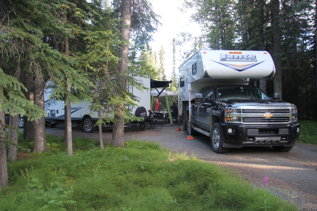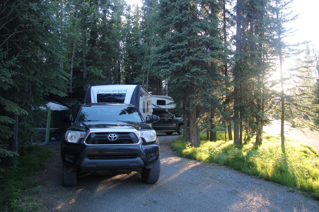 Arrivés à Atlin, on se rejoint au Centre d’information touristique. Et oui, il y en a un et en plus, la dame parle français et tellement heureuse de pouvoir le faire. Elle nous indique les attraits touristiques, les campings et aussi où rejoindre le départ de la piste. Nous allons au camping près de l’eau avec 2 services (eau et électricité). L’endroit nous plait, on s’installe.