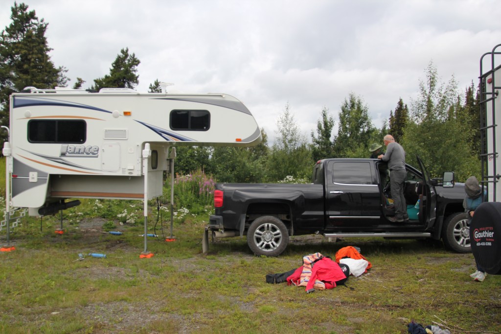 Finalement, suite à nos commentaires au sujet de la pluie (voir article précédent), Lucie et Claude ont décidé d’aller vers Whitehorse pour éviter la mauvaise température et c’est là que nous les avons rencontrés. Jean-Claude était à l’extérieur au moment de leur arrivée. Il a cru un moment que Claude était au volant mais s’est dit qu’il y a plusieurs unités comme la leur. C’est au moment de voir Lucie sortir de la camionnette qu’il a compris que c’était bien eux et nous de voir la stupéfaction sur son visage. Mission accomplie pour la surprise!!!