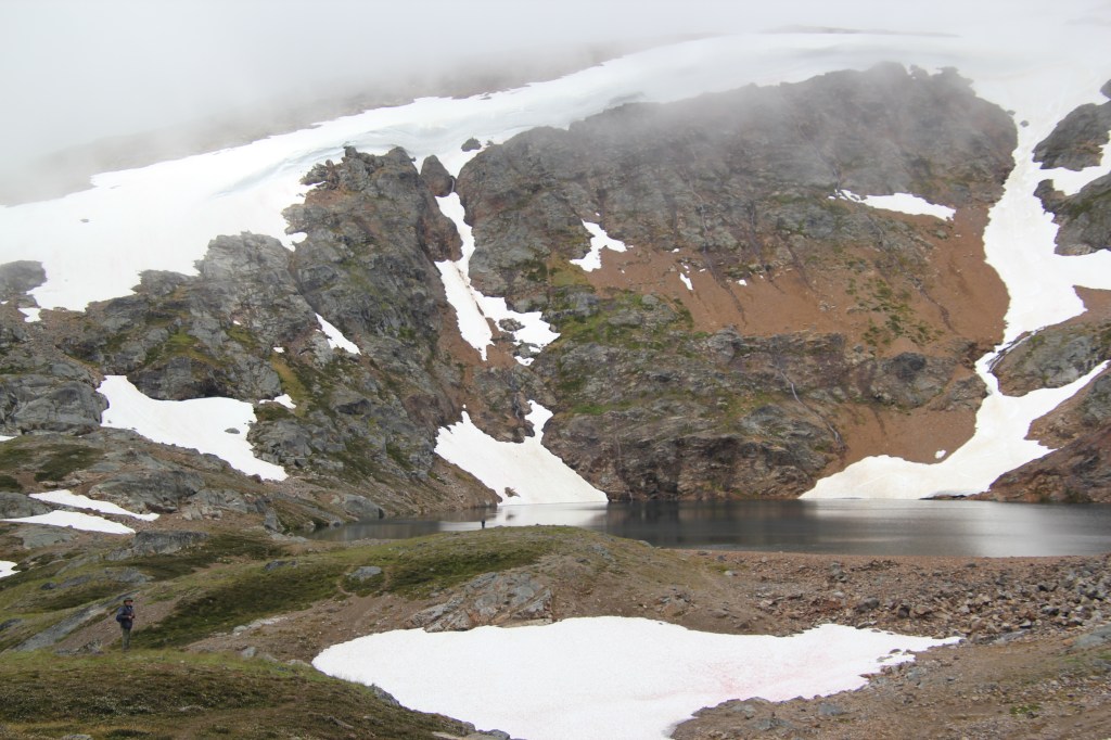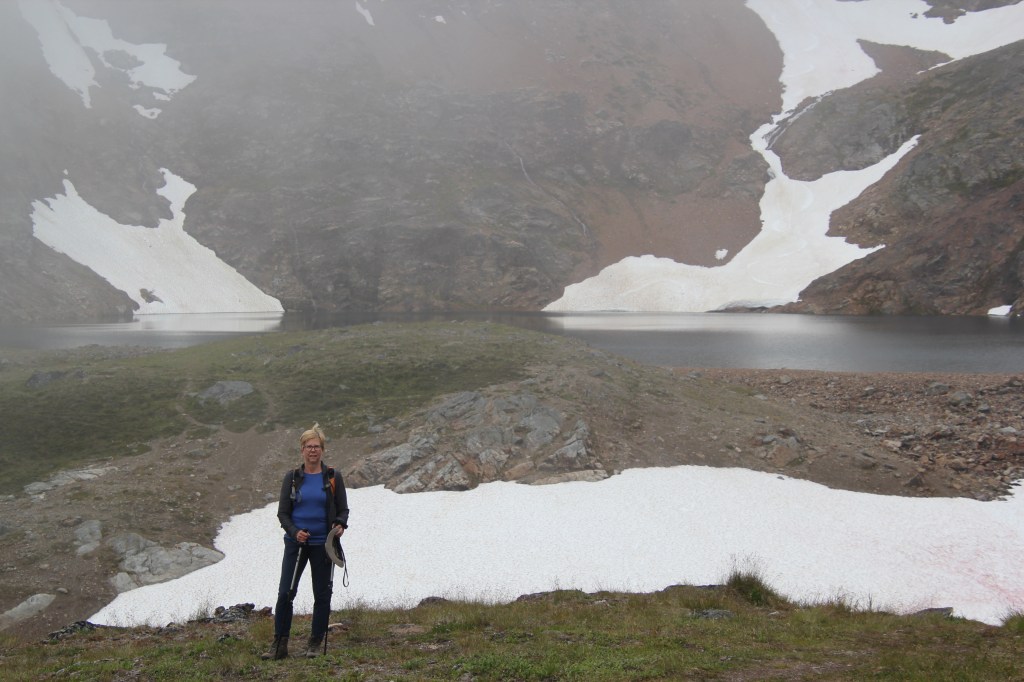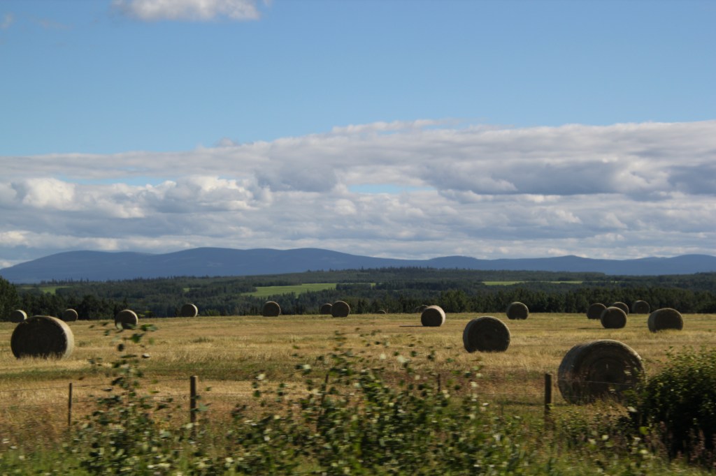 Départ ensuite pour une belle randonnée à Hudson Bay Mountain (Crater Lake Trail) mais il faut d’abord faire 24 kilomètres de montée en camion et roulotte dont la moitié sur une route de gravel. Début de la randonnée dans le bois avec nos amis habituels, les maringouins, puis dans les grands champs au-dessus de la ligne d’arbres. Nous nous sommes rendus dans le brouillard, sans rien voir. Mais à notre arrivée, le vent s’est levé et quels merveilleux paysages. Le lac, situé à 1700 mètres, semble installé dans un cratère. Il est alimenté par un glacier. On voit aussi, les traces récentes d’un planchiste. Et que dire des montagnes avoisinantes. 3 kilomètres de randonnée pour s’y rendre, qui valaient le déplacement! Après la randonnée, 400 kilomètres de route vers le Sud. Les montagnes laissent place peu à peu à de grandes vallées. C’est le temps des foins! Nous rejoignons Jean-Claude et Lyne environ 60 kilomètres après Prince George, sur la route vers Vancouver … au Canada! Comme des adolescents, nous en avions beaucoup à nous raconter sur les 36 dernières heures.