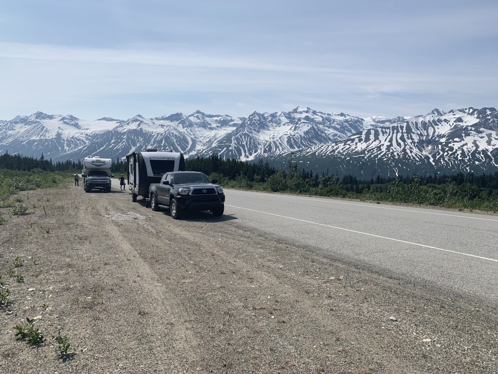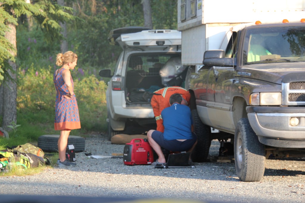 Le lendemain, nous avons repris la route vers Fairbanks, pour s’apercevoir qu’elle ne valait guère mieux que la route Dempster, donc en très mauvais état. Un kilomètre à la fois, nous avons continué notre petit bonhomme de chemin au sein du Parc Kluane puis retour en Alaska. En espérant pouvoir y trouver un camping, nous nous sommes rendus au State Park de Moon Lake. Quelle chance pour un 4 juillet: un beau camping sur le bord de l’eau!!! Nous n’avions pas encore vu les très gros maringouins américains. Très affectueux, ils nous ont suivi en masse jusque dans nos équipements. Imaginez un peu la chasse aux maringouins dans la roulotte et le campeur à 3 heures du matin. Pourtant, nos deux hommes, en bons samaritains, s’étaient endormis tout heureux d’avoir secouru Amanda, la voisine de camping avec sa crevaison et son pneu de secours tout dégonflé. Pendant ce temps … vaisselle pour Lyne et Micheline … en regardant les preux chevaliers portant secours à la belle de l’Alaska, une « jumper fire » de feux de forêt!