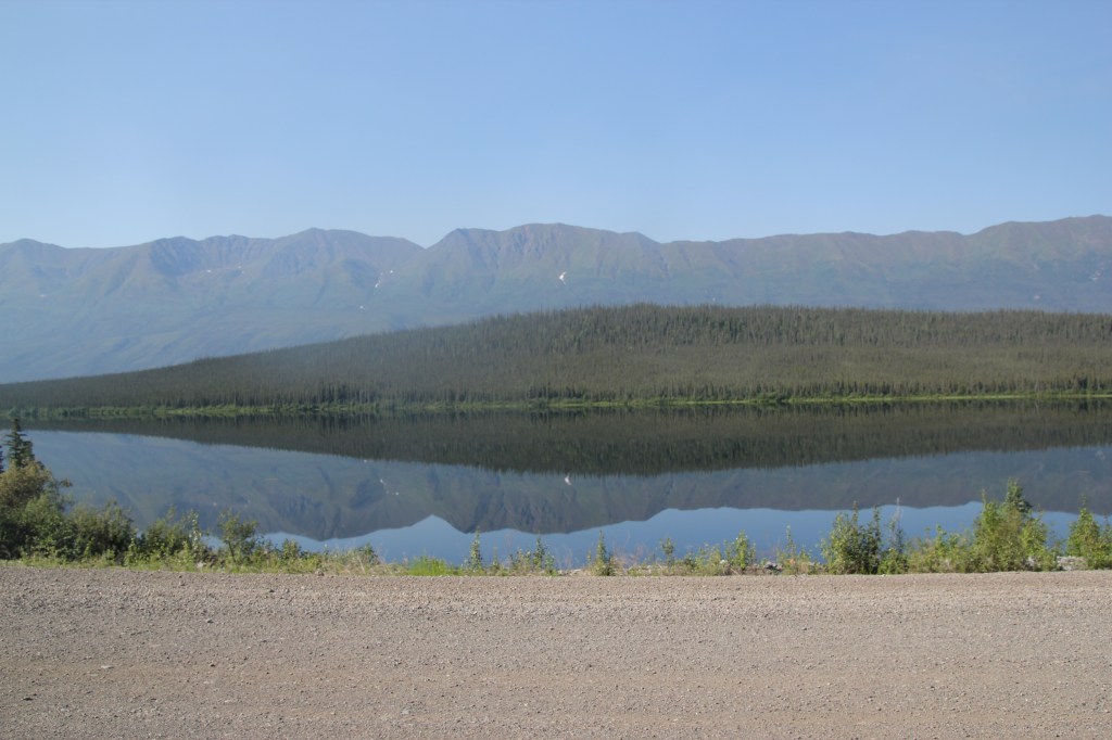 Après une nuit difficile avec les bateaux qui se promenaient sur l’eau (pourquoi entrer se coucher si le soleil ne se couche pas) et les maringouins, nous avons repris la route, non sans s’inquiéter un peu de la senteur de fumée et du smog qui s’était installé, voilant complètement le ciel et résultant de feux de forêt en activité. Le feu actif aperçu sur la route quelques minutes plus tard ne nous a pas nécessairement rassurés… Pas de photos car tout est dans la brume.