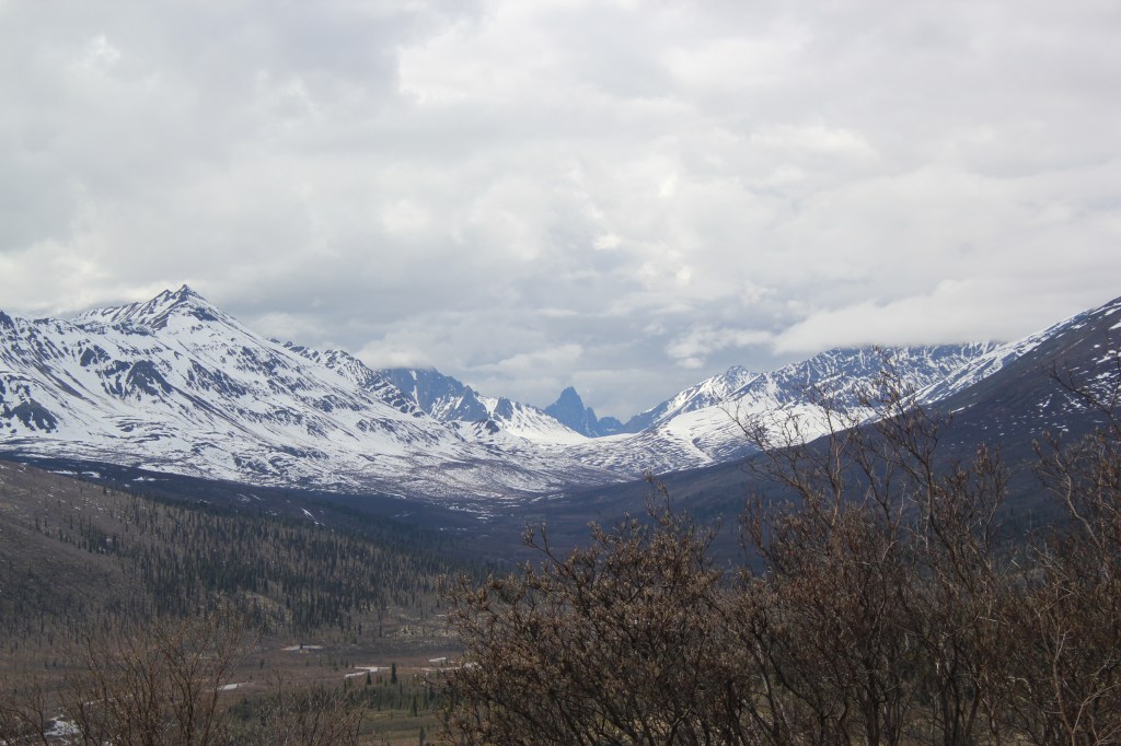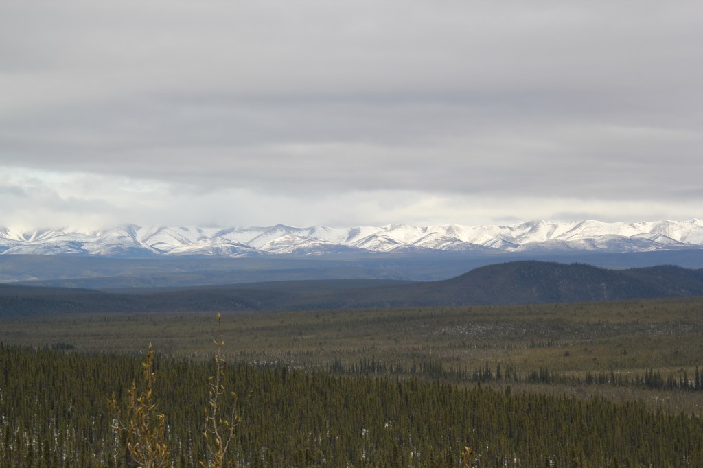 1523 milles (2 400 Km). Construite en 1942, en neuf mois, par 11 000 membres des Forces armées et 16 000 civils du Canada et des États-Unis. 133 ponts et 8 000 ponceaux. Elle relie Dawson Creek de la Colombie-Britannique à Fairbanks en Alaska en passant par Whitehorse au Yukon. Nous avons débuté la route mardi (31 mai) après le dîner et 200 km plus loin nous avons vu apparaître les premières montagnes enneigées des Rocheuses du Nord. Camping au parc provincial de Buckinghorse Wayside. Tous les terrains sont sur la rivière. Les répulsifs à ours en aérosol et sonore (bruit d’un coup de fusil), achetés à Dawson Creek, sont maintenant à portée de main.